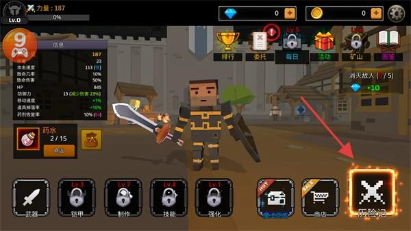 在主界面点击【历险记】进入关卡,当前【力量-187】,装备初始武器,目标是【消灭敌人-(1/5)】。