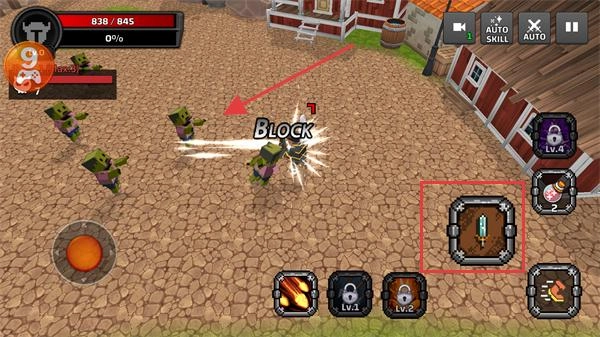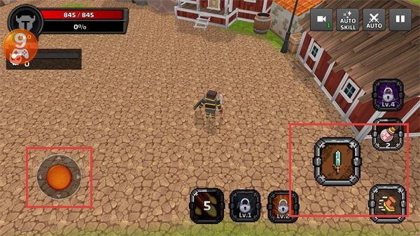 进入战斗场景后,点击左侧的技能按钮来释放技能,右侧的道具栏能够使用武器类道具,当前生命值显示为【845/845】。