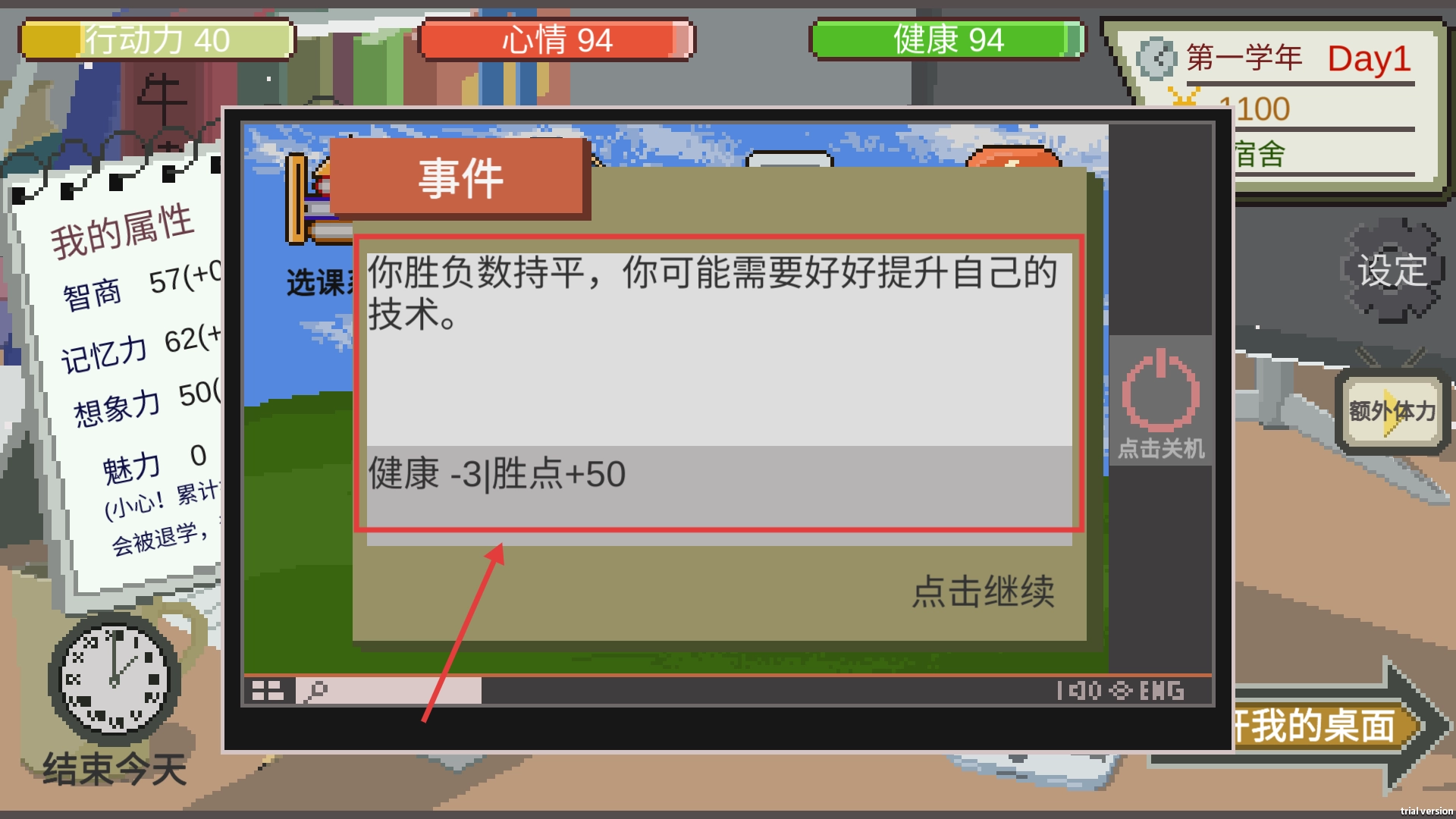 当胜负场次持平需要处理相关情况时,可选择通过减少3点【健康】属性来获取50点胜点,之后则要着重提升技术水平以实现各属性的均衡发展。