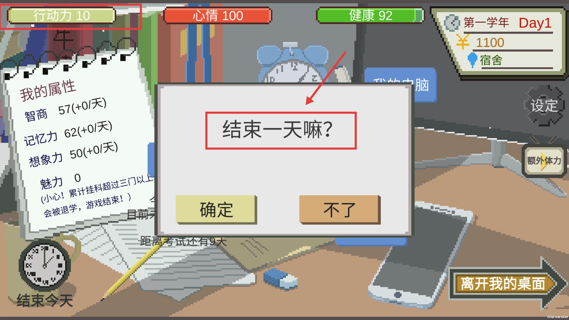 当行动力剩余【10】时就确认结束当天,这样能防止属性因过度消耗而降低,从而保障第二天的状态稳定。