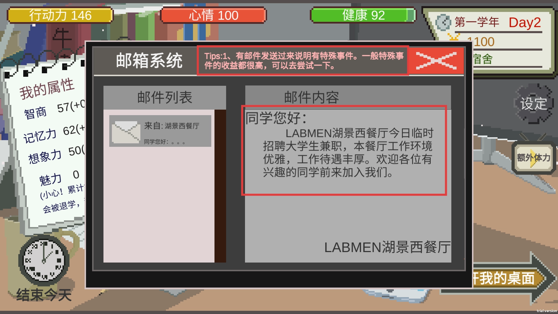 查看【邮箱系统】中的兼职邮件,报名参与【湖景西餐厅】的兼职工作,既能获得丰厚待遇,还能提升自身能力属性。