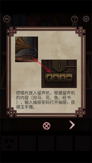 将唱片放入留声机,根据提示打开抽屉,获得玉手镯;