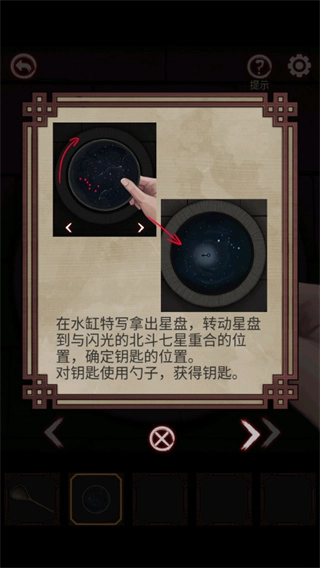 将星盘对准水缸里面,转动,然后用勺子拿起钥匙;