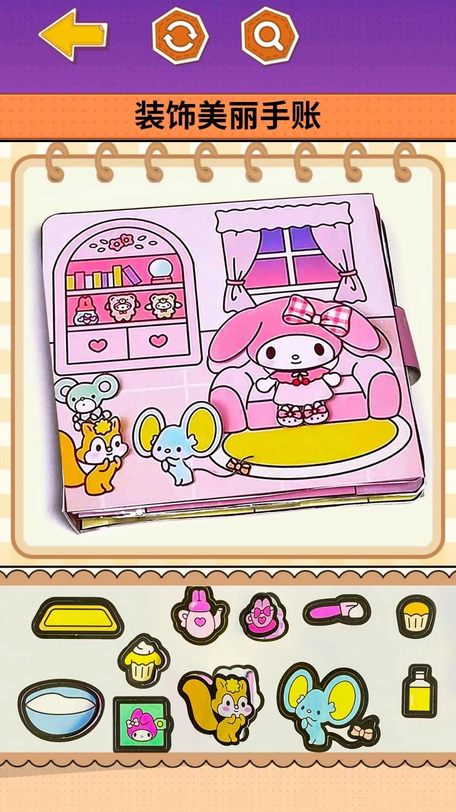 3、玩家可以借助贴纸制作手帐,游戏里的材料与道具十分丰富,还包含不少可爱的咕卡贴纸,只要充分发挥想象力,就能随心打造出专属于自己的静谧书屋。