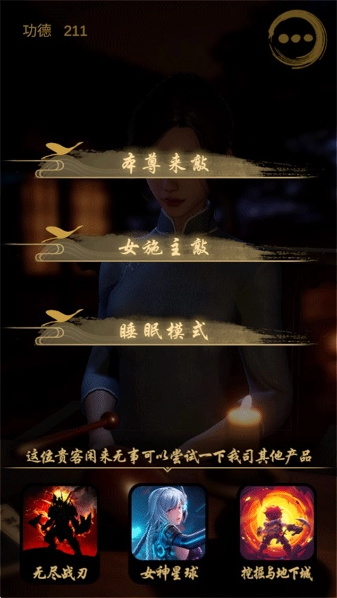 5、另外,游戏里还设置了“睡眠模式”,开启该模式后,屏幕会调节到最暗状态,仅保留木鱼的声效,为您打造一个极度放松、帮助入眠、安定心神的沉浸式环境。