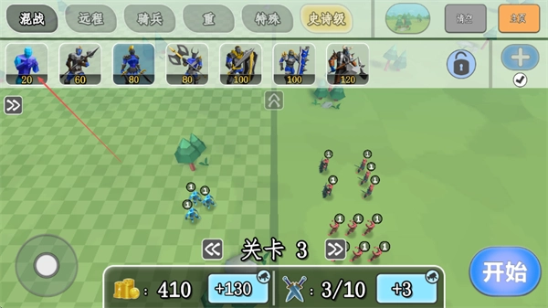 1、在兵种界面挑选混战类等兵种,花费金币进行部署,点击开始按钮进入关卡3的战斗。