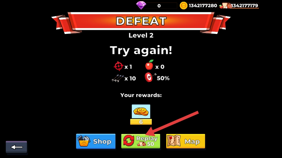 关卡失败后,点击【Replay】按钮,重新挑战第二关(Level2)。
