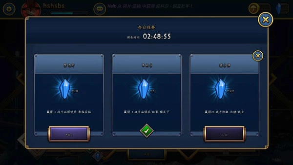 在游戏大厅页面点击“任务”按钮,就能查看每日任务;系统每天会发布三个任务,完成后可领取对应的宝石奖励。