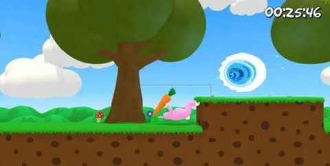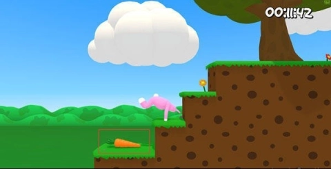 接下来就轮到你操控兔子翻到目标位置,按下跳跃键完成抓取动作。只要兔子抓住胡萝卜的根部或者尾部,就可以把它拿起来;持续按住抓取键的话,就算随意翻滚也不会有问题。
