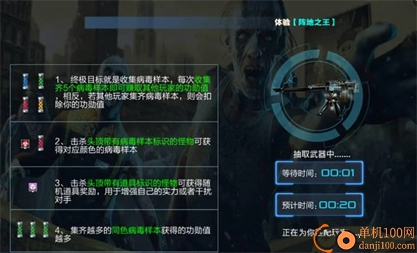 病毒样本有红、蓝、黄、绿四种颜色分类,玩家击杀带有对应颜色符号的僵尸,就能得到相应颜色的病毒样本。除此之外,还有一种僵尸头顶带有问号标识,将其击杀后,会随机获取某一种颜色的病毒样本。