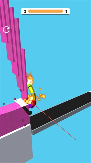使用切片工具切割粉色障碍物,通过切割降低它的高度,以此推动关卡进度——上方的进度条显示当前关卡正从2向3推进。
