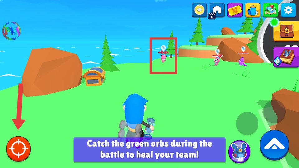 当遭遇怪物(例如粉色怪物)时,点击左下角的瞄准按钮,瞄准怪物并准备进行捕捉。