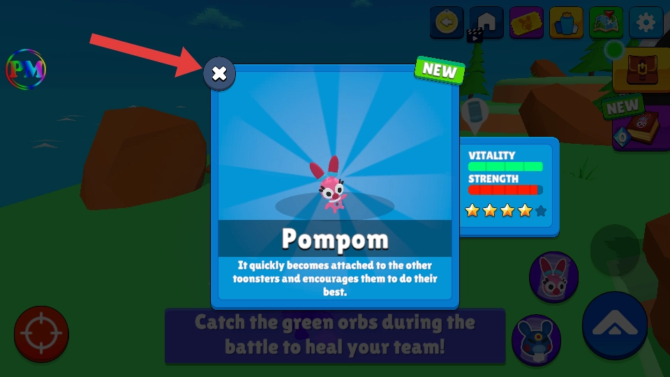 成功捕捉到像Pompom这类怪物后,会弹出怪物的详情界面,点击关闭按钮就能继续游戏。