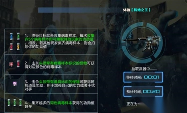 病毒样本有红、蓝、黄、绿四种颜色,击败带有对应颜色标识的僵尸就能得到相应颜色的病毒样本。除此之外,还有一种头顶带有问号的僵尸,将其消灭后会随机获得某一种颜色的病毒样本。