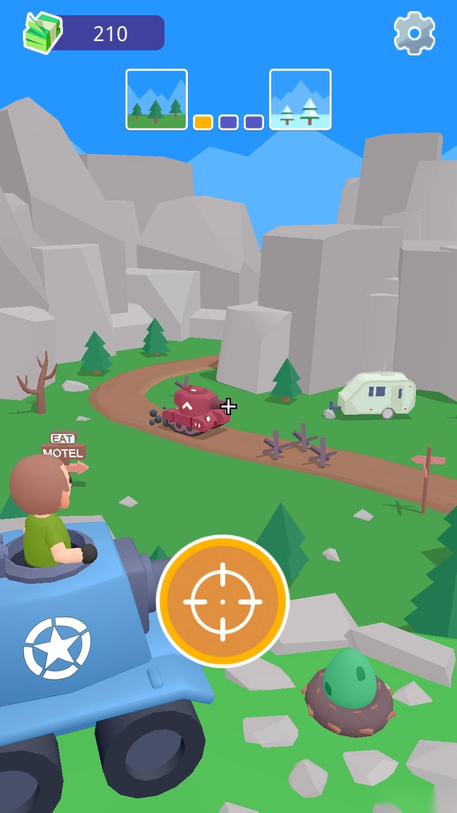 进入游戏即可开启第一个关卡的挑战,这关难度不高,只需点击瞄准装置,锁定敌人后马上开炮就行。