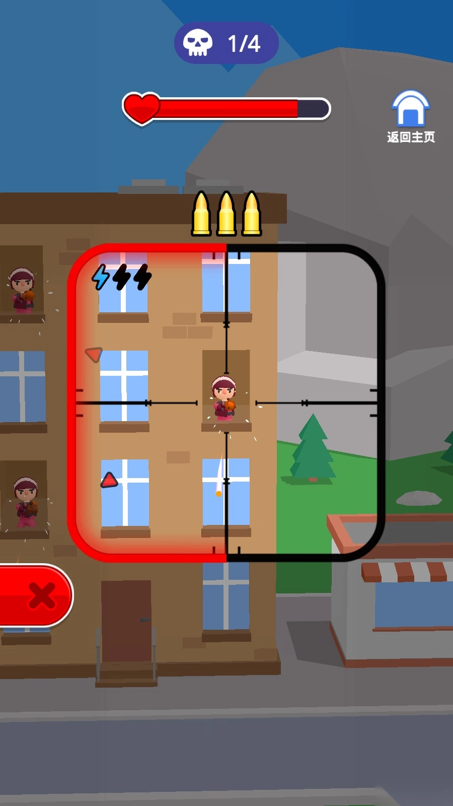 继续挑战其他关卡,还能攻击楼房里的敌人,得自己瞄准射击。