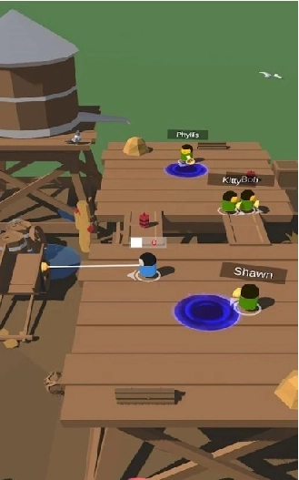 3、每个小人手中都握着一把能喷出吸盘的武器,要是精准地击中敌人,就能把敌人往自己身边拽一段距离。
