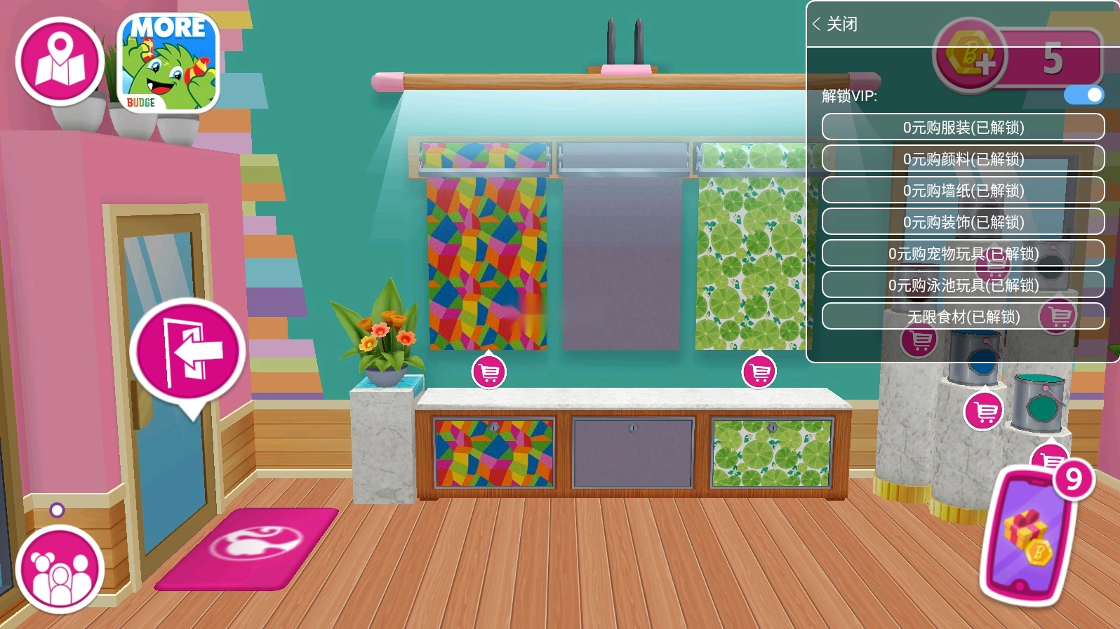 游戏已,mod菜单(进入游戏后再开启,否则可能出现闪退,失效的情况),包含内容:1、vip可用;2、0元购服装(已解锁);3、0元购颜料(已解锁);4、0元购墙纸(已解锁);5、0元购服饰(已解锁);6、0元购宠物玩具(已解锁);7、0元购泳池玩具(已解锁);8、大量食材(已解锁)。(注意:使用菜单前需要提前开启游戏的悬浮窗权限,并开启相应功能) 芭比梦幻屋历险记点评