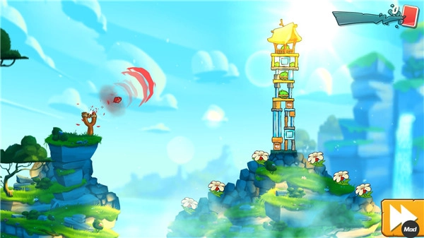 1、游戏延续了第一部的经典玩法,需要使用弹弓将不同种类的小鸟发射出去打绿猪