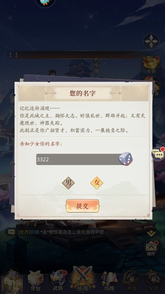 创建角色信息(提供随机名字或简单命名)。
