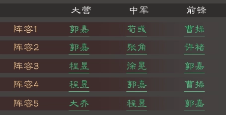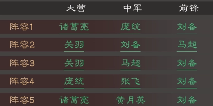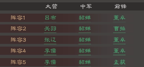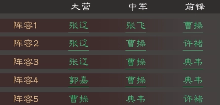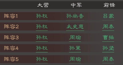 3三位武将可组成一套阵容,通过前排、中军、大营的布局来决胜千里。