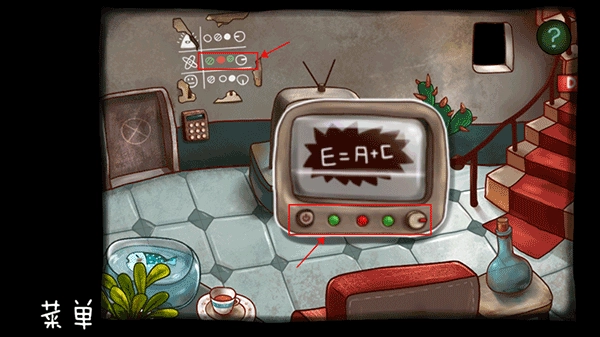 回到楼下后,先点击电视机,接着按下电视机左下角的开机按钮,然后调整中间的三个指示灯和右侧的旋钮,使它们的状态与墙上的排列保持一致;待电视开启后,即可获取信息E=A+C。