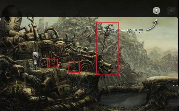 1、启动机械迷城手机版游戏后,会看到一些游戏介绍内容,点击画面中标红的区域,上方盒子下方会出现机器人的身体部分,左下角则是机器人的头部,两者会自动组合成一个完整的机器人。