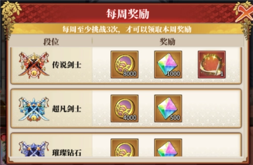 2.每周奖励属于循环发放的奖励类型,每个赛季中参与挑战达到3次及以上的玩家,在新赛季开启且段位完成重置后,能够在玩法界面进行领取。