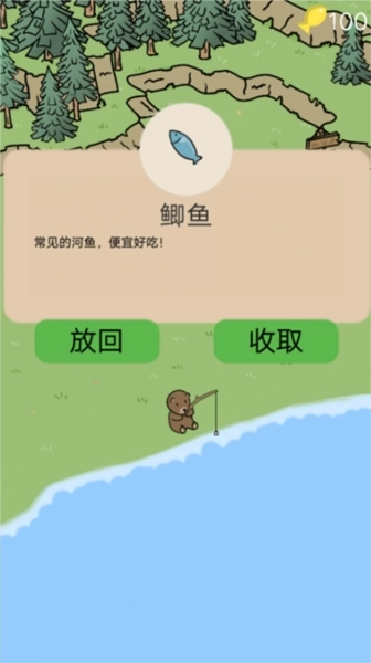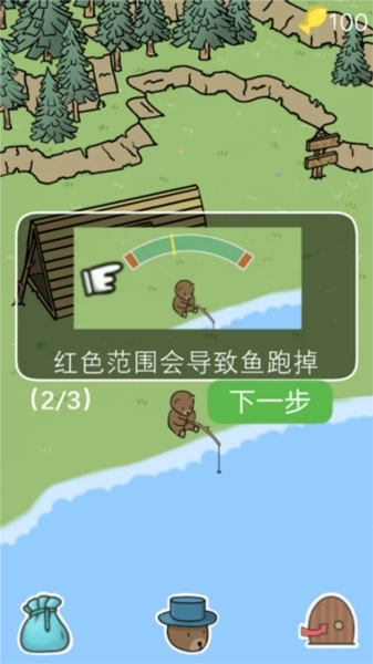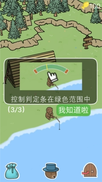 1、在池塘边,玩家操控小熊拿起鱼竿钓鱼,当成功钓到鱼时,需要长按屏幕来消耗小鱼的体力;