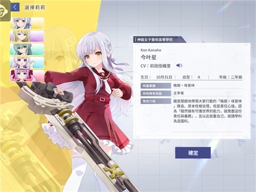 游戏在新手教学期间会让玩家自选1个5星角色;一般而言选自己喜欢、对其有感觉的角色会比较好,毕竟这些并不是限定角色玩久了总是会到手的。但如果要追求极限强度和效率的话,则可以选神庭女子高等艺术学校中的「今叶星」或百合丘女学园的「枫」;
