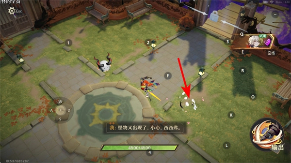 3、按照红色箭头的指示行动,操控角色接近怪物所在区域,在触发战斗后保持持续攻击。