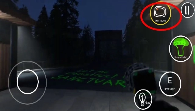 点击“Play”按钮开始游戏。屏幕左侧设有虚拟摇杆,用于控制角色前后左右移动;右侧的“E”键可用于射击或开门操作,靠近左侧的图标可切换灯具照亮周围环境,最上方的功能则用于抓取碎片。