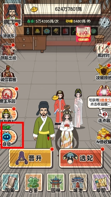 解锁左侧的自动功能,同时开启自动和连点器,让你的元宝收益快速提升。