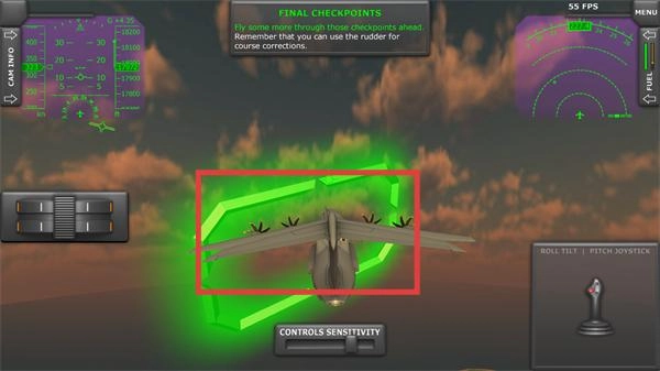 1、处于【FINAL-CHECKPOINTS】阶段时,需操控飞机穿过呈【绿色方框状】的检查点,以此达成该检查点的穿越规定。