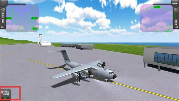 4、飞行任务完成后,操控飞机降落在跑道上时,可借助左侧的【REVERSE-THRUST】功能来辅助减速并停靠。